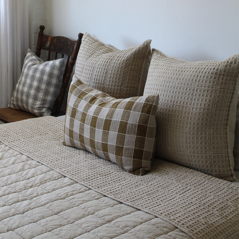 Elevate your bedroom with the Camille Bedcover Set from French Signature. This beautifully textured, double-sided design brings softness, warmth and effortless style to your space. The king sized 260×260 cm bedcover features a reversible finish: one side with a clean, large-grid pattern and the other with a finer waffle texture, allowing you to change your look with a simple flip. Crafted with a 100% cotton shell and filled with a lightweight polyester padding, the Camille Bedcover Set offers soft comfort without the heaviness and weight of a traditional quilt - perfect for the Australia climate. Complete the look with the two matching 60×60 cm pillows in the small grid-waffle weave, the Camille Bedcover Set offers a cohesive, layered look that instantly makes your bedroom feel styled yet effortless