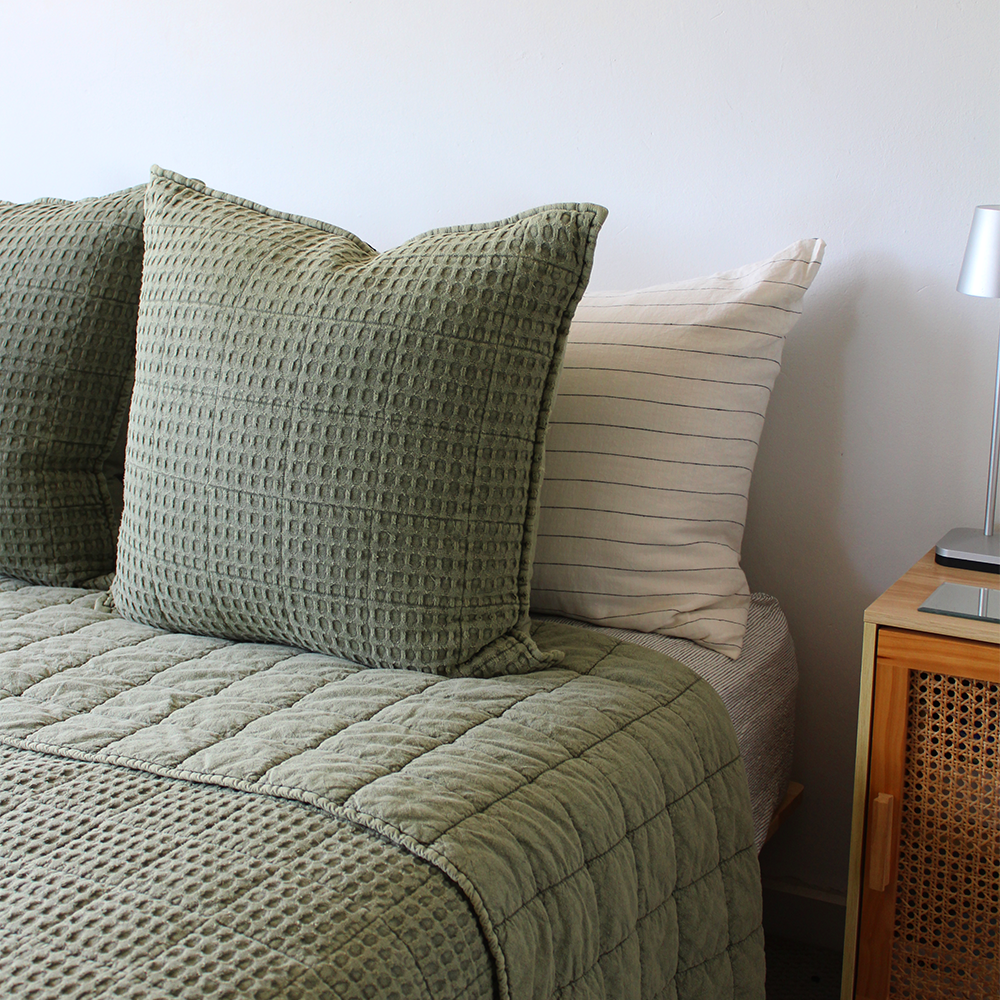 Elevate your bedroom with the Camille Bedcover Set from French Signature. This beautifully textured, double-sided design brings softness, warmth and effortless style to your space. The king sized 260×260 cm bedcover features a reversible finish: one side with a clean, large-grid pattern and the other with a finer waffle texture, allowing you to change your look with a simple flip. Crafted with a 100% cotton shell and filled with a lightweight polyester padding, the Camille Bedcover Set offers soft comfort without the heaviness and weight of a traditional quilt - perfect for the Australia climate. Complete the look with the two matching 60×60 cm pillows in the small grid-waffle weave, the Camille Bedcover Set offers a cohesive, layered look that instantly makes your bedroom feel styled yet effortless