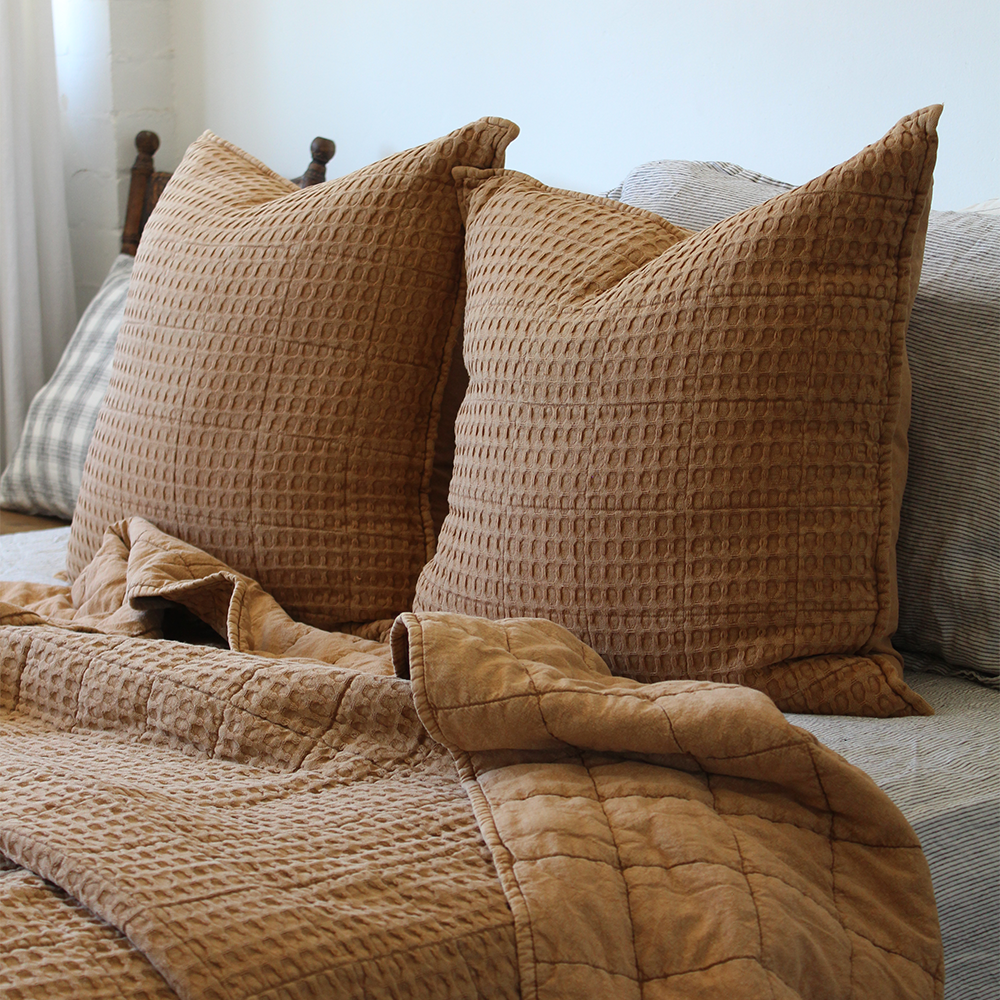 Elevate your bedroom with the Camille Bedcover Set from French Signature. This beautifully textured, double-sided design brings softness, warmth and effortless style to your space. The king sized 260×260 cm bedcover features a reversible finish: one side with a clean, large-grid pattern and the other with a finer waffle texture, allowing you to change your look with a simple flip. Crafted with a 100% cotton shell and filled with a lightweight polyester padding, the Camille Bedcover Set offers soft comfort without the heaviness and weight of a traditional quilt - perfect for the Australia climate. Complete the look with the two matching 60×60 cm pillows in the small grid-waffle weave, the Camille Bedcover Set offers a cohesive, layered look that instantly makes your bedroom feel styled yet effortless